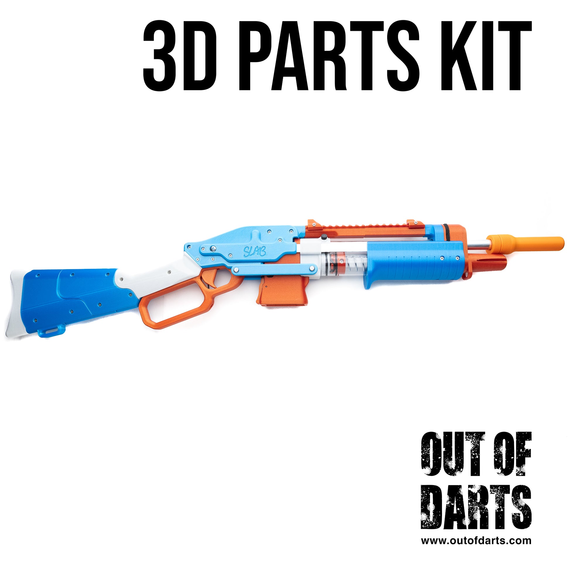 Sillybutts' Lever Action Blaster (SLAB) is an awesome blaster with a lever action prime and makes for a powerful primary in any Nerf game. This 3D-printed blaster kit includes all the hardware and 3D-printed parts to build your own SLAB, including an Orange Trivictus Mega XL Silly SCAR for your blaster. Additionally, this kit includes the Large Lever option to allow for gloves or padding to be added, our heat-set insert rod cap for easier tuning, and the bottle-nose sling cap with a long plunger rod.