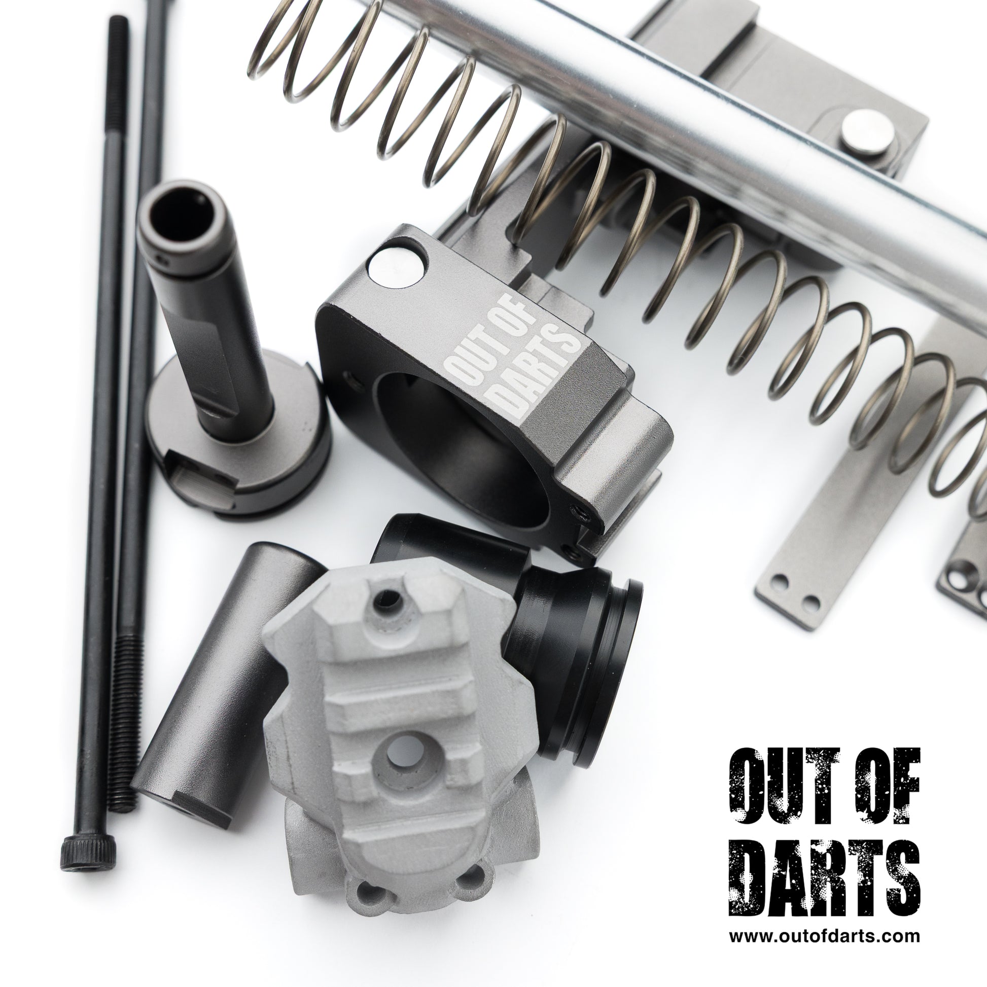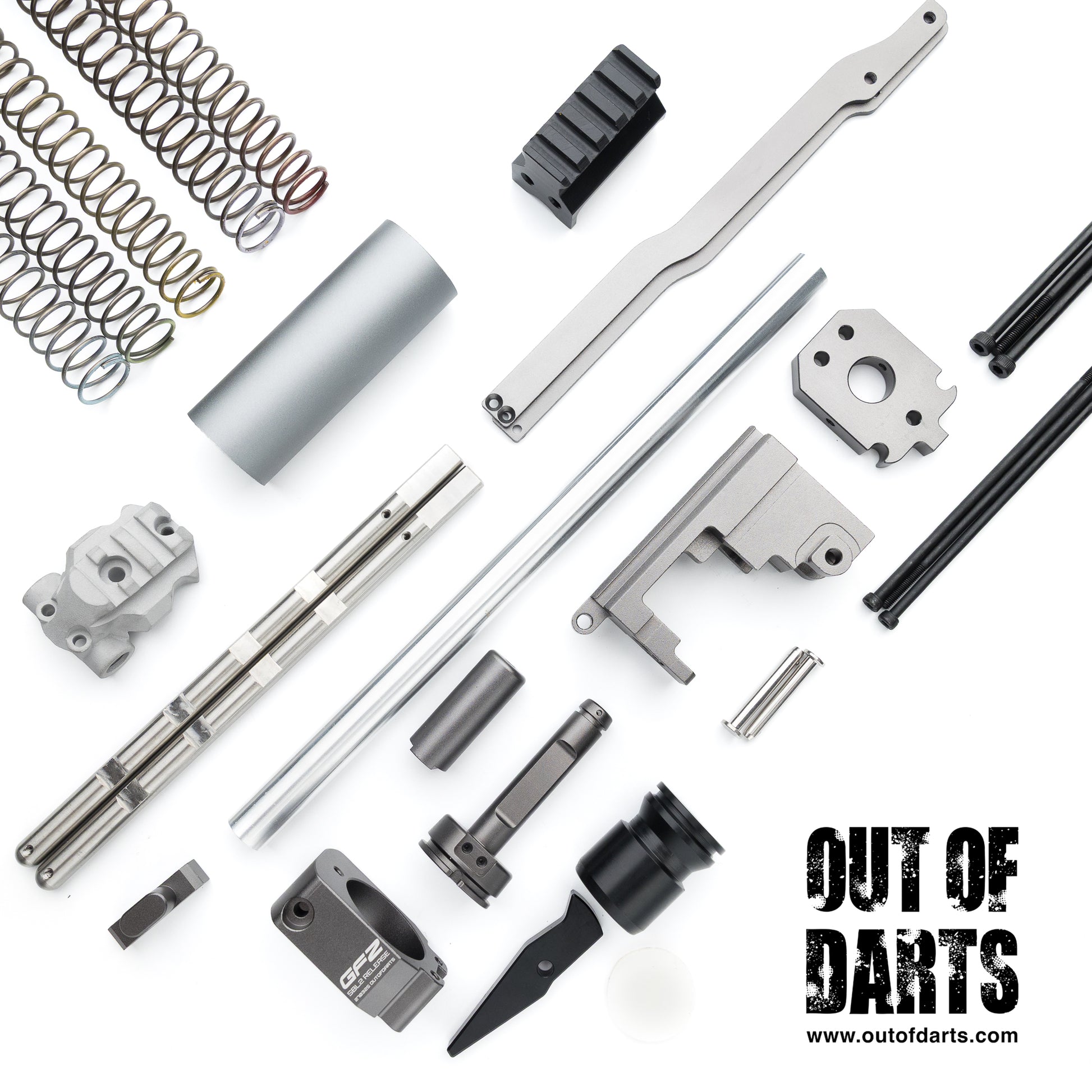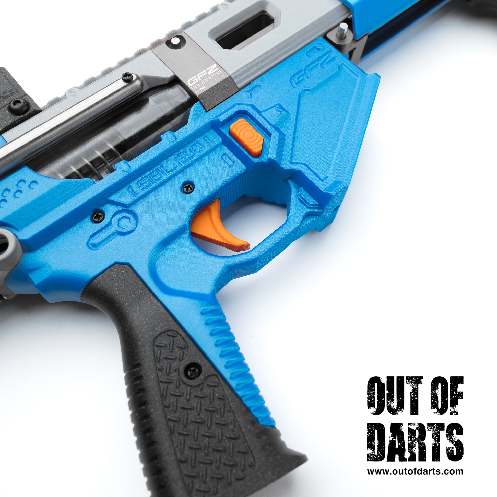 The GFZ SBL 2.0 is a 3D-printed springer designed and produced by Gavin Fuzzy Customs. Featuring five color-coded springs and a two-pin toolless takedown system, this versatile and durable blaster can be quickly tuned to virtually any FPS. Its solid-feeling construction and short, smooth prime stroke make it a joy to operate. Additionally, its sleek, compact design, accented by colorful anodized internals, makes it a capable and stylish primary option for competitive and close-quarters battle games.