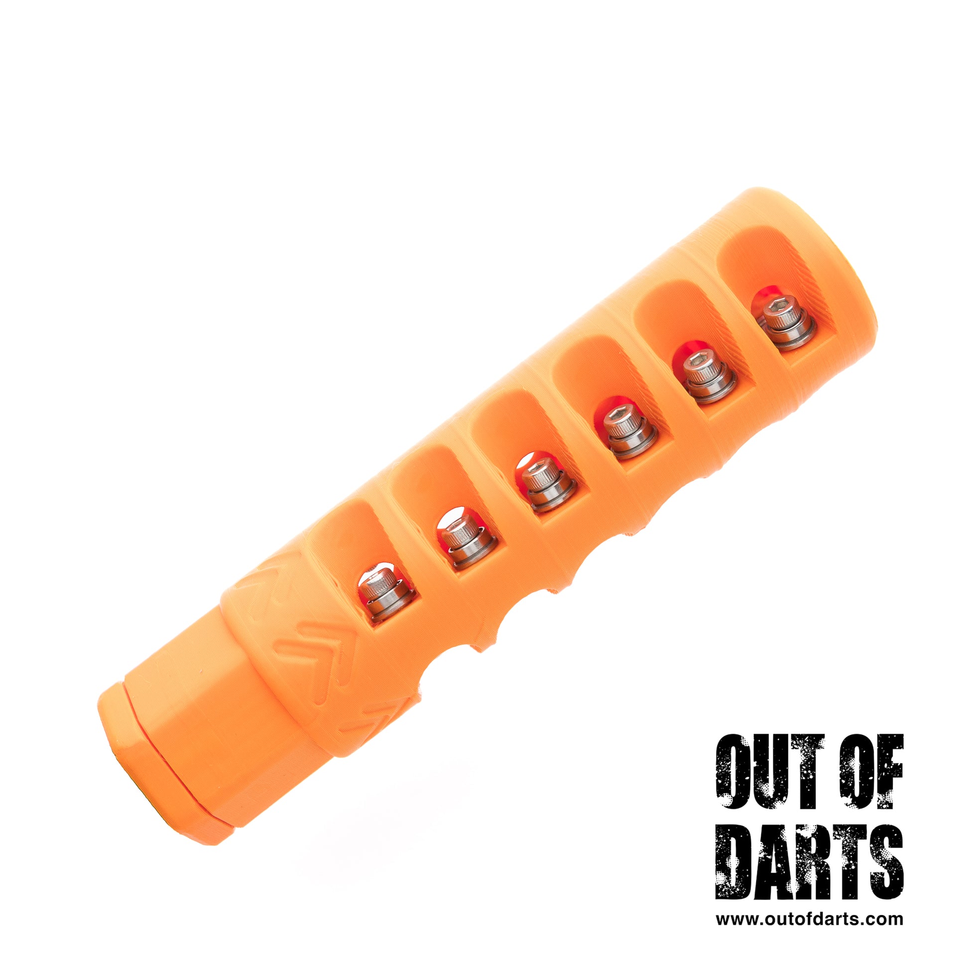 The Shearforce PBCAR is a 3D-printed variable-mode rifling attachment platform inspired by the principle behind the Rexfire Akasha “Super BCAR.” Featuring an initial, more aggressive PCAR segment to pre-rotate the dart, followed by a gentler BCAR segment, this muzzle device is the cutting edge of springer accuracy. With a low-profile collet, this BCAR fits snugly on as little as 20mm of 16mm or similar OD exposed metal barrel. Additionally, internal baffling, or optional porting, controls and disperses turbulence from higher-volume, under-barreled blasters,