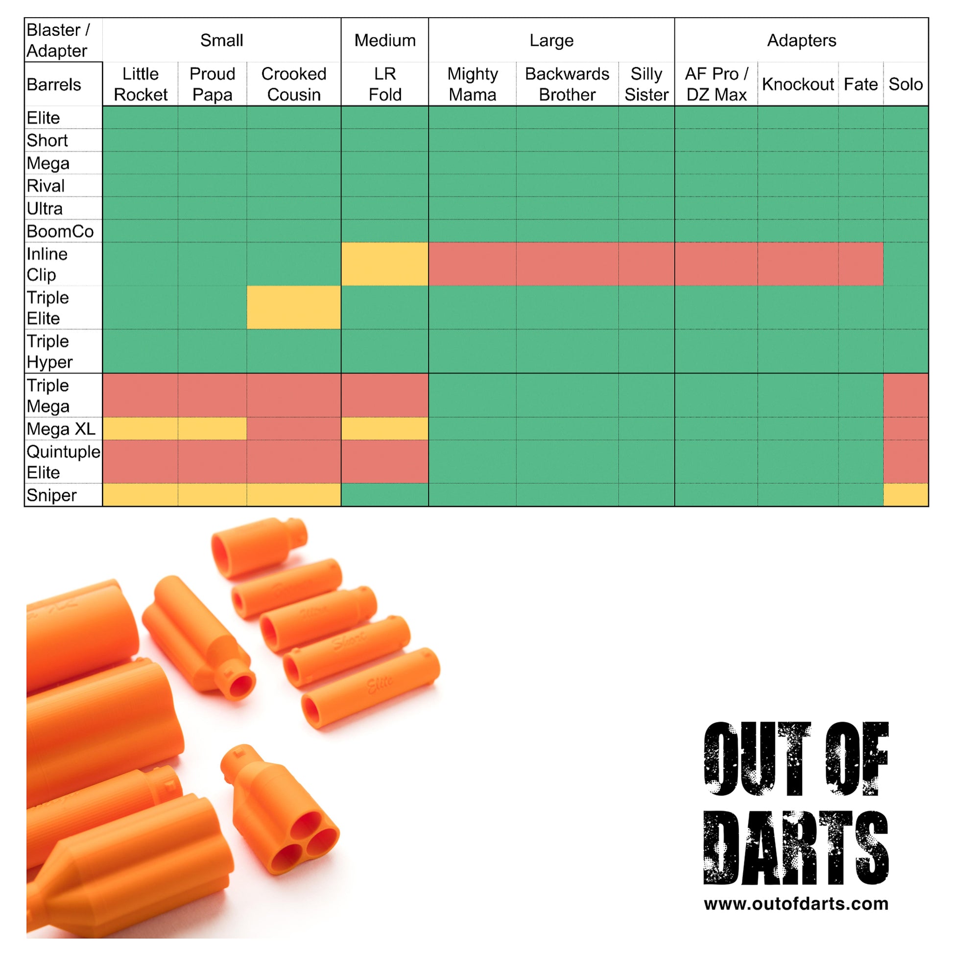 The Little Rocket Barrels are a versatile, modular set of barrels for the Little Rocket Family Platform of blasters and adapters. With a signature twist-locking breech system, easily swap barrels with various foam-flinging ammo types- and easily swap compatible blasters with loaded barrels ready to go! All barrels are printed in OOD Orange.