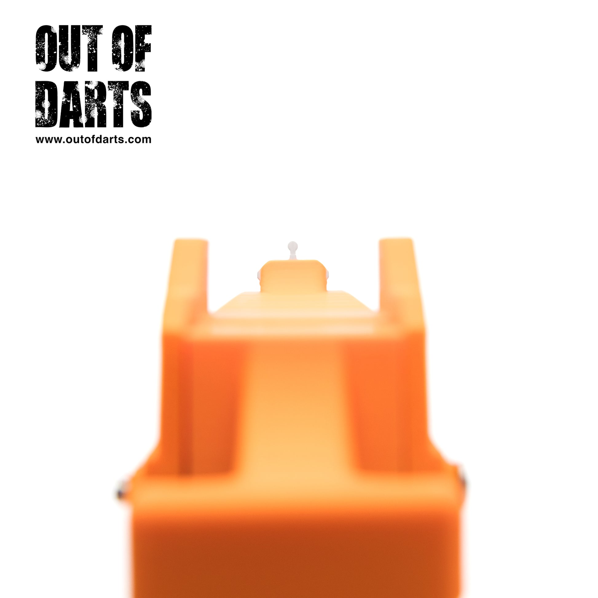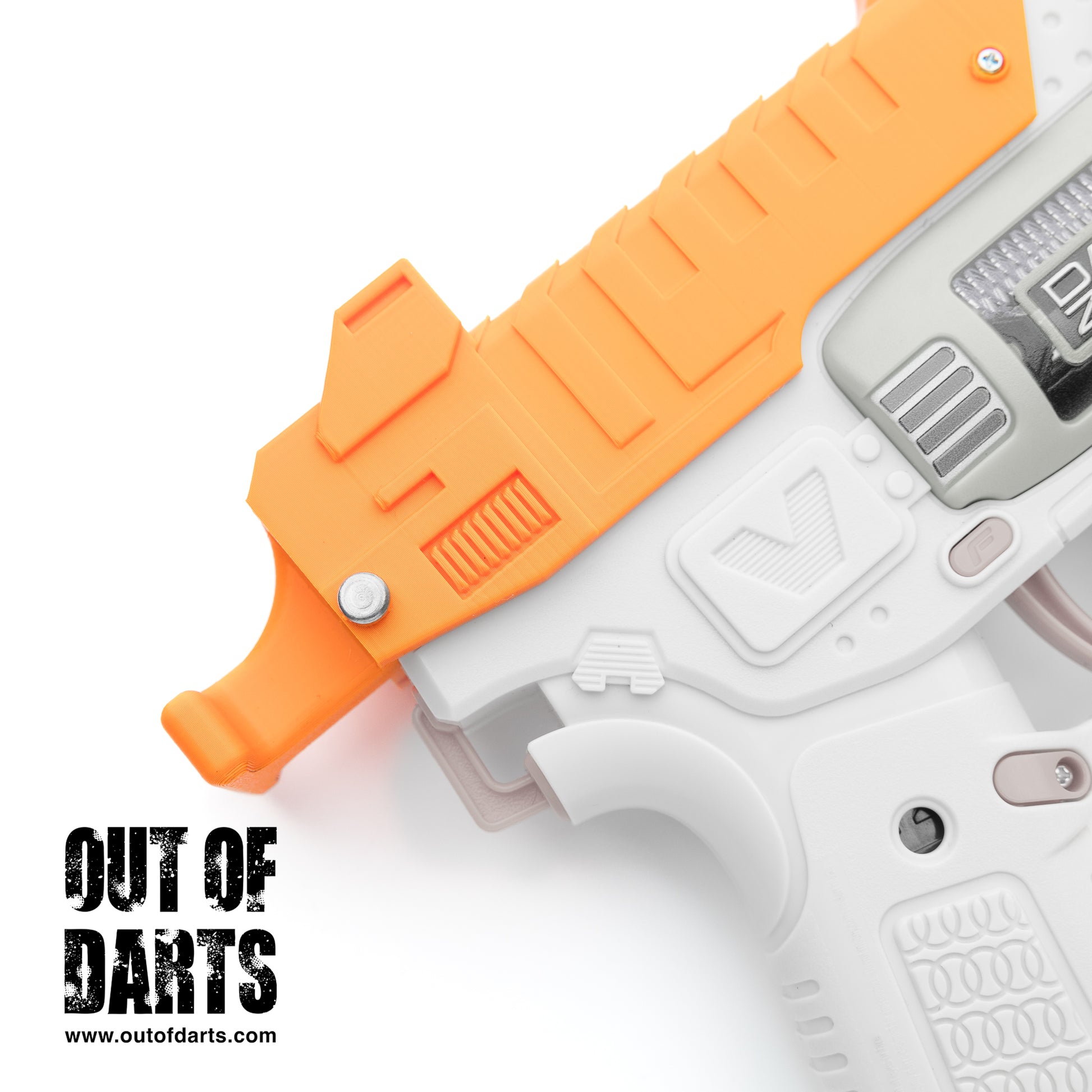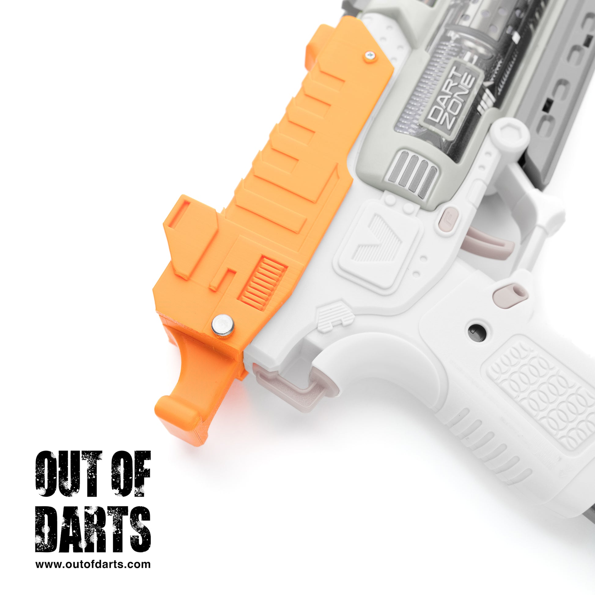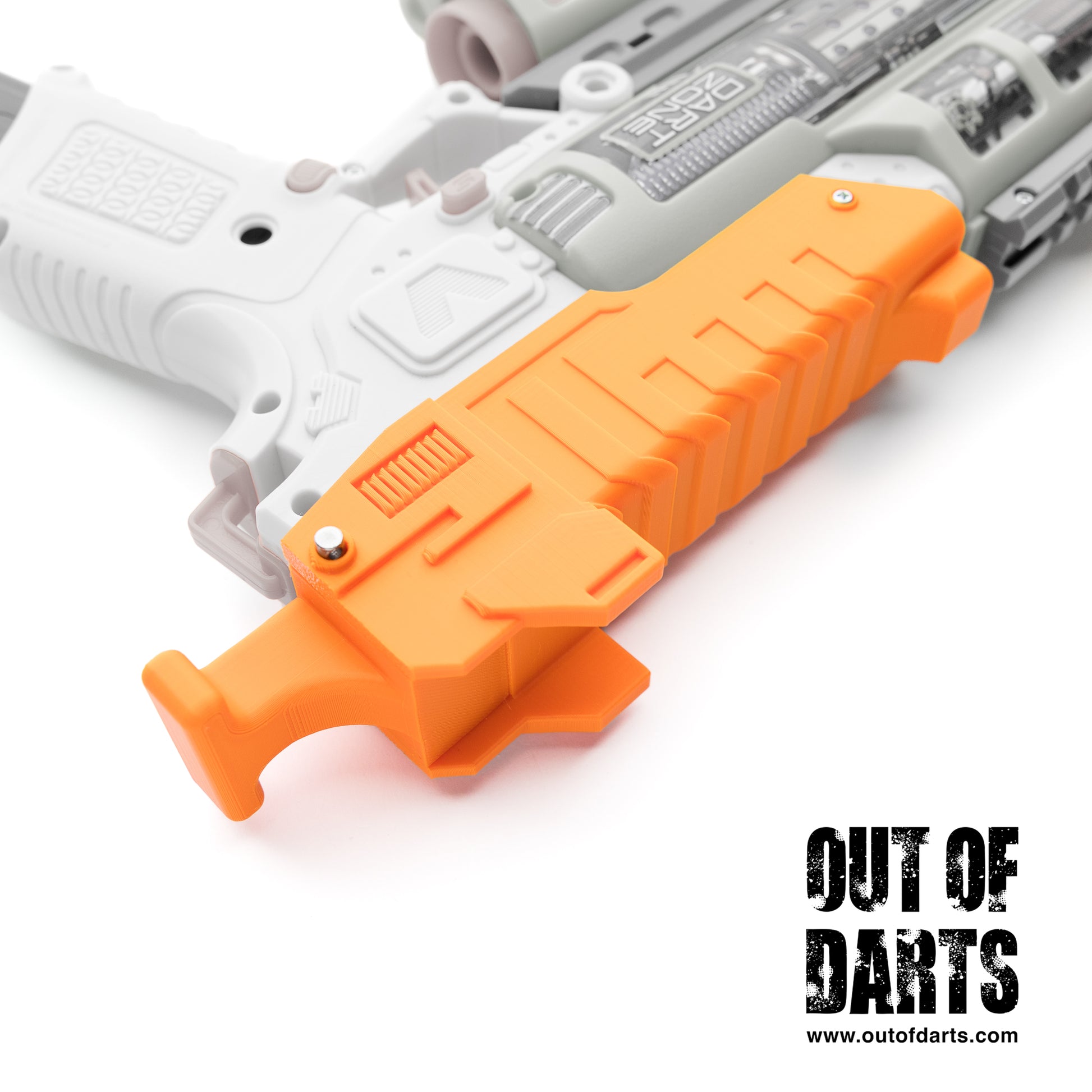 The Luchathor Volcanic Pro T-Pull is a 3D-printed priming grip for the Dart Zone Max Nitroshot+ Volcanic Pro. Featuring an exaggerated hand stop and a low-profile rear T-Pull, grip with rounded edges, this handle is a more comfortable alternative to the existing top slide prime. Additionally, the included single takedown pin reinforces the handle for prolonged durability. Printed in OOD Orange.