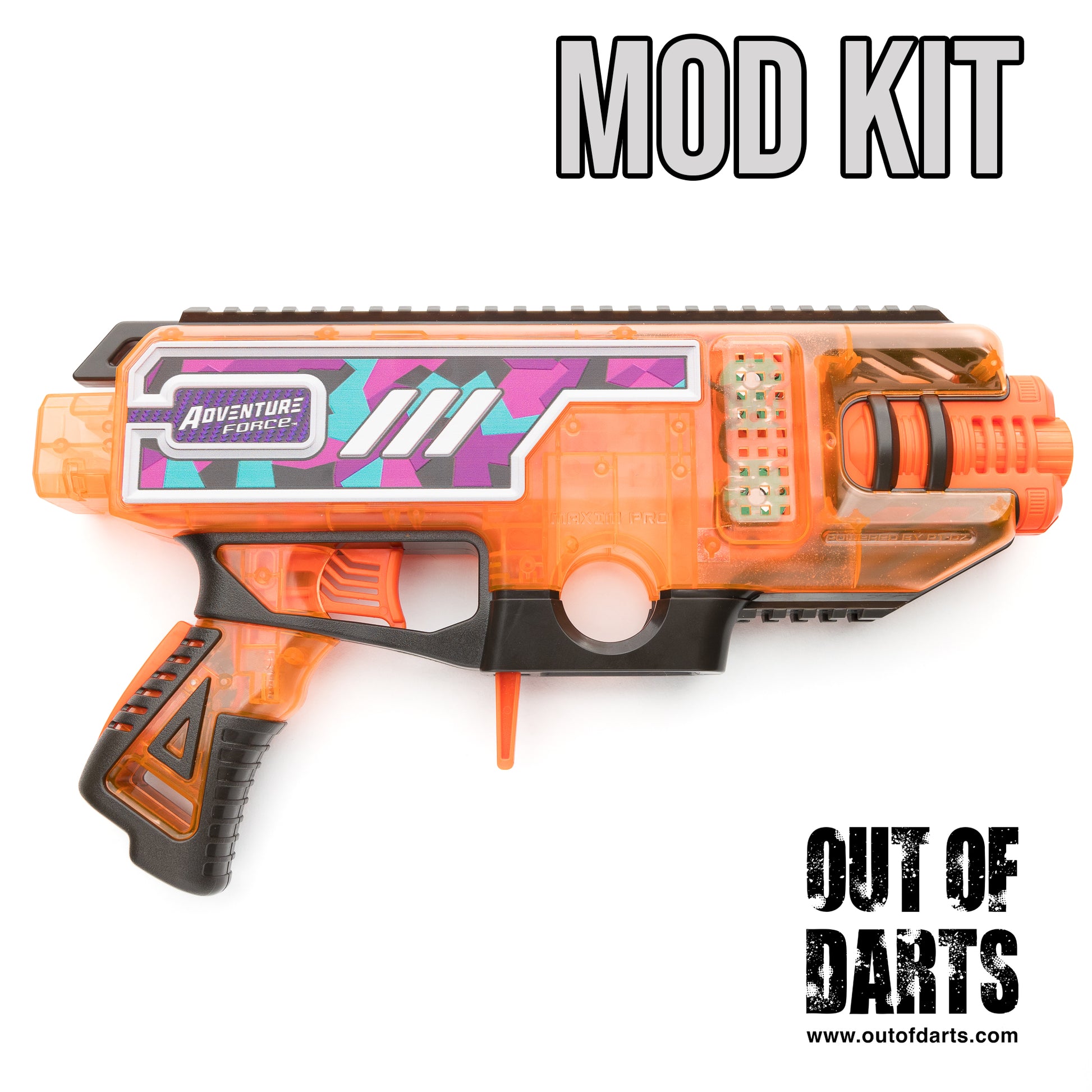 This Maxim Pro Mod Kit is a complete build-your-own kit with every mod kit option available for the Adventure Force Tactical Strike Maxim Pro. Whether you want a new flywheel cage, full-auto, a satisfying solenoid, or some combination of the three, this listing has got you covered. More mods and kits will be available soon!