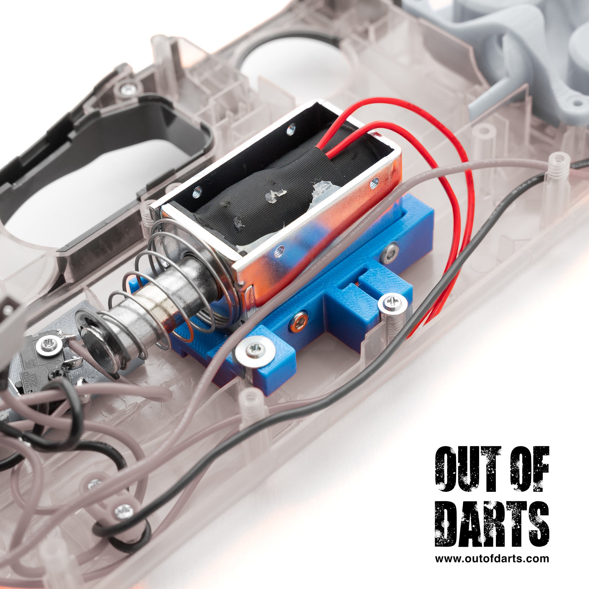 The Maxim Pro Neutron Solenoid Cage is a 3D-printed mounting bracket designed to secure the OOD X Eli Wu Neutron Solenoid inside the Adventure Force Maxim Pro flywheeler. This completely replaces the stock mechanical pusher with an electro-mechanical one, making for a satisfying trigger pull and simulated recoil. Additionally, this mod allows for a two-stage trigger setup or solenoid-powered full-auto mods (sold separately).