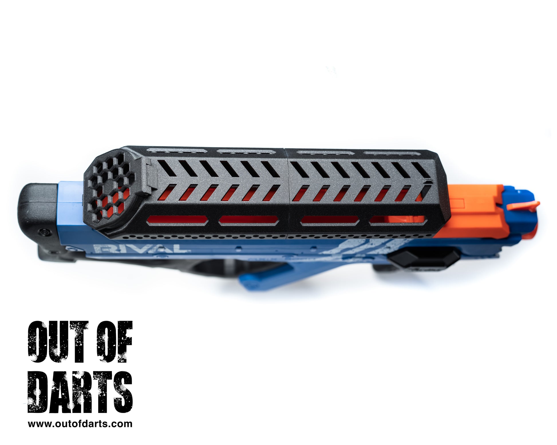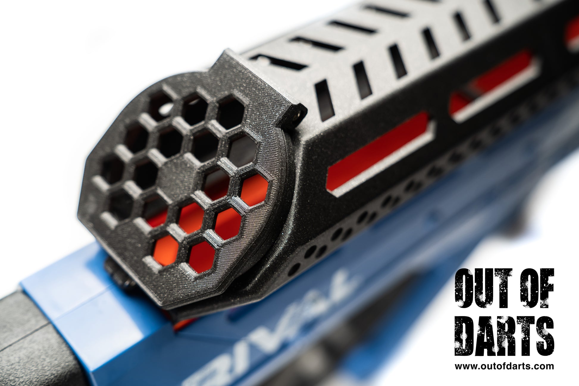This drop-in Nerf Rival Perses Extended Hopper for the Nerf Rival Perses increases your ammo capacity while maintaining a sleek look and feel to the blaster. There are two lid options, 'No Lid' for those who want to use a paintball speed load gate (sold separately) or 'With lid' for a magnetic 3d printed lid (pictured).