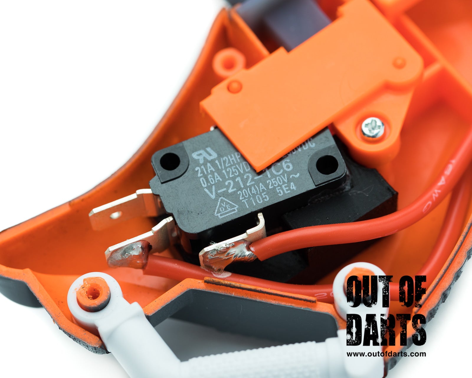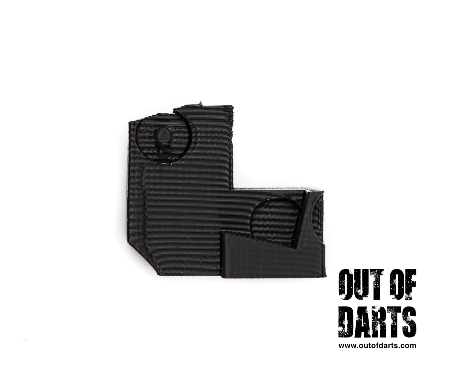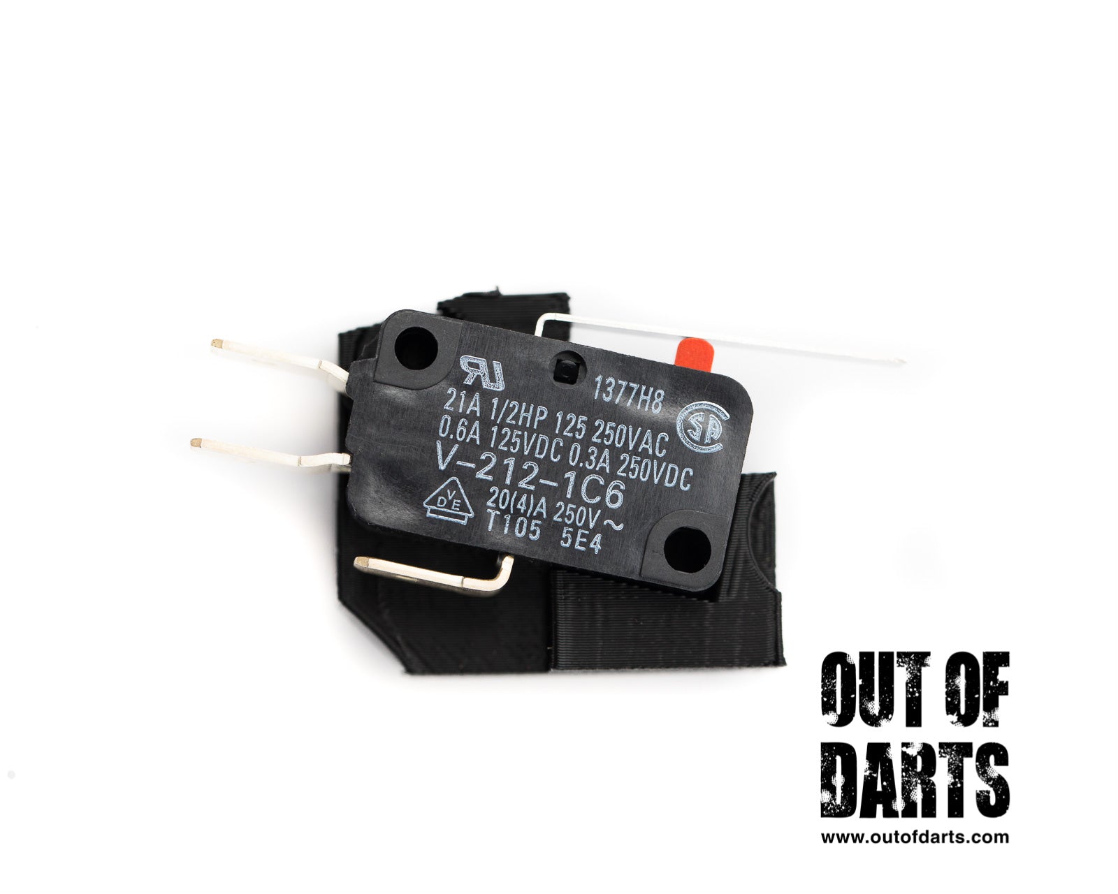 After building dozens of Stryfes, Luke made a switch plate to make installation easier and more reliable. This 3D printed Stryfe Switch Mounting Plate is the final product designed specifically for the Nerf Stryfe. It allows for a very simple installation of the rev trigger. This is designed for the 21A/15 Omron and clone switches we carry, creating an ideal trigger switch placement.