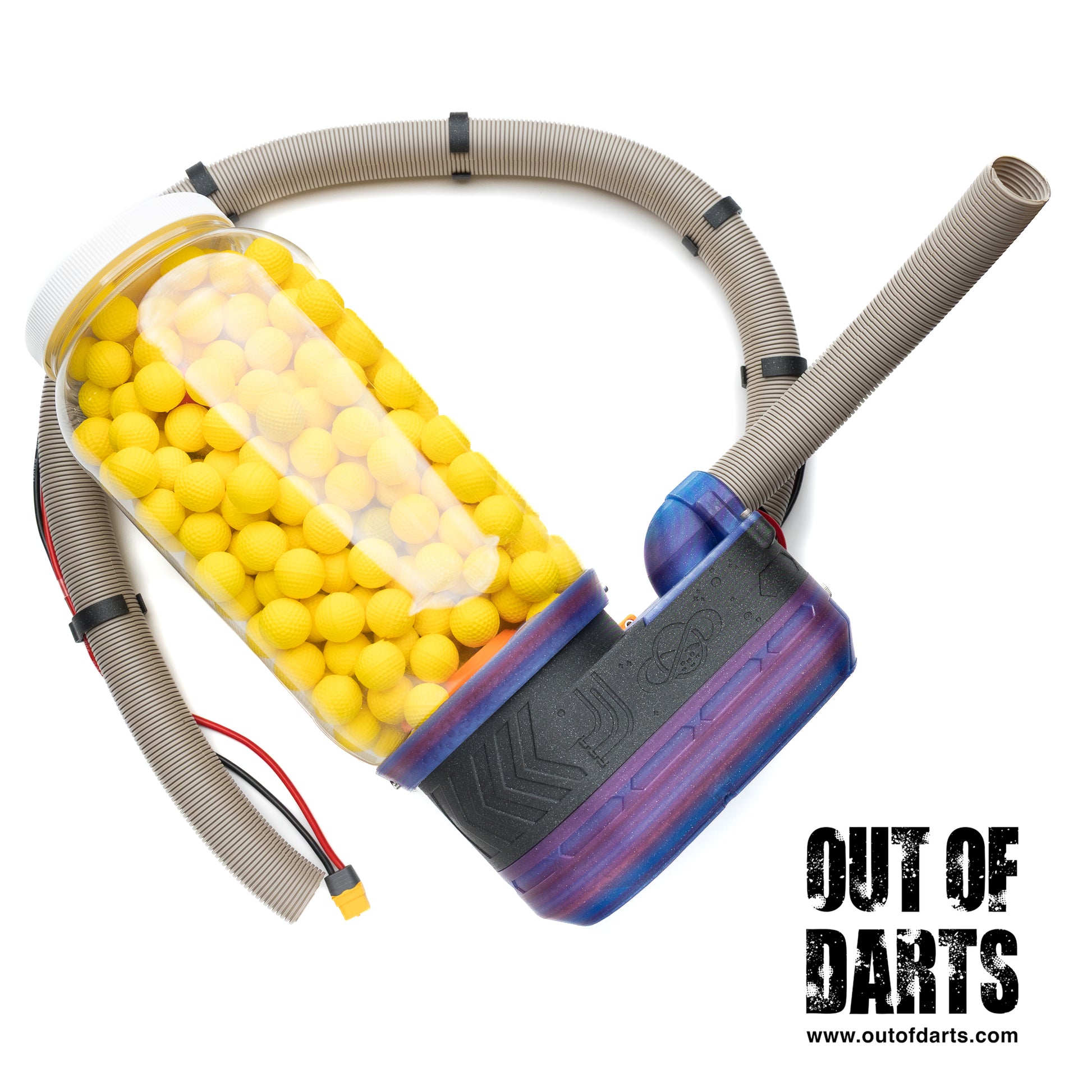 The OOD Infinite Pack is an original custom-designed hopper for rival and rival-compatible blasters. Featuring a brushless blower-pressurized system and a gear motor-driven agitator, this feeding system can reliably deliver an impressive 20 rounds per second from the pack to a blaster through up to four feet of hose. Additionally, the current-sensing printed circuit board makes setup intuitive and straightforward: Just plug the pack into your blaster's battery terminal! The pack's LiPo will power both the feeding system and the blaster.