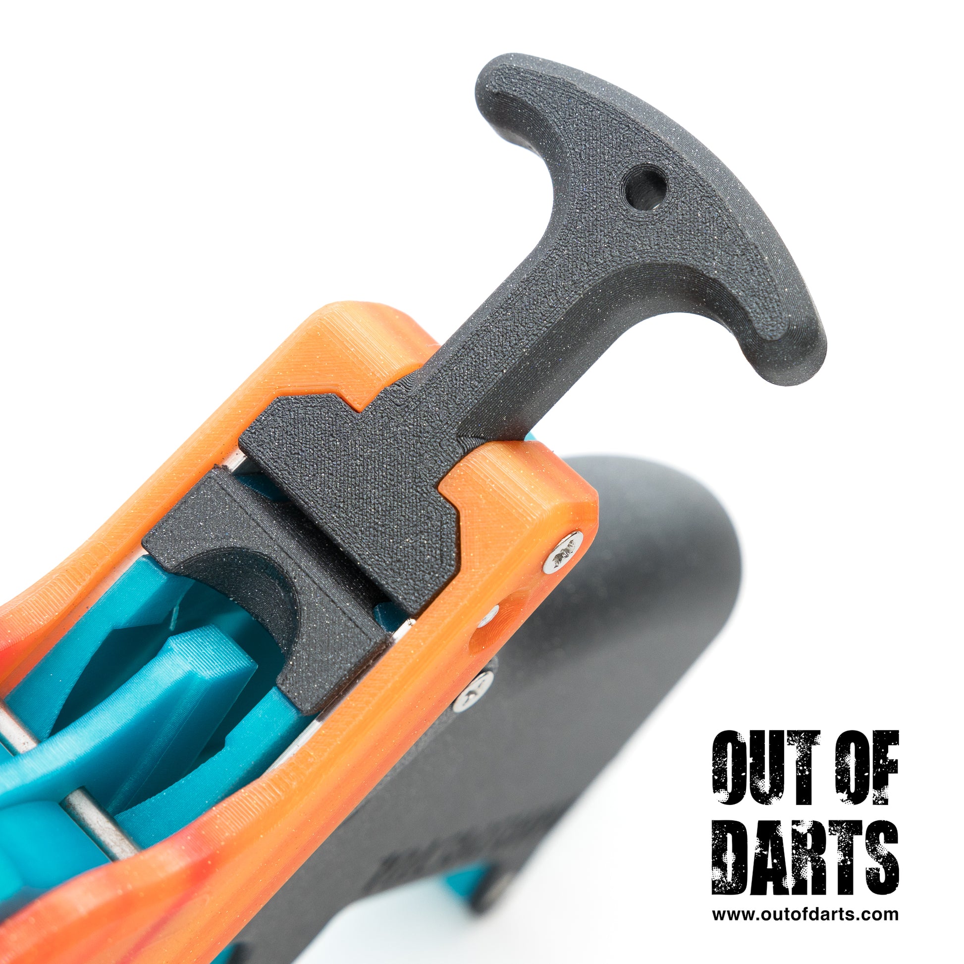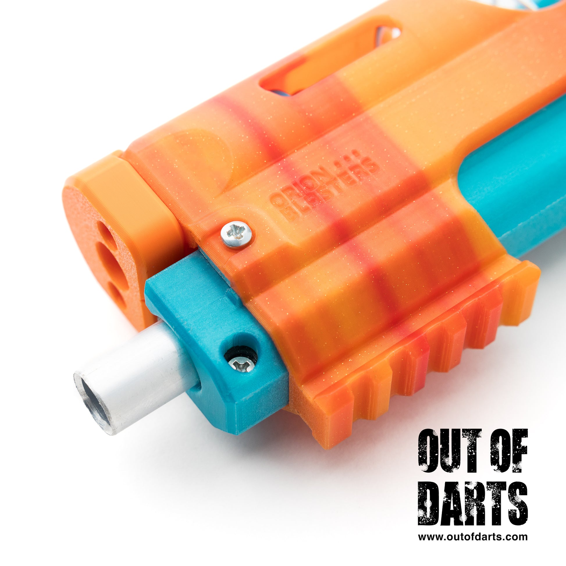 The Orion Blasters DanPistol is a versatile and powerful springer sidearm originally designed by the creator of the Lynx and its derivatives. Featuring a similar turnaround system with its own unique pivoting ram, this blaster accepts both standard and angled talon mags through the oversized main grip. Additionally, you can prime this blaster in a variety of ways, With a rear T-Pull, an optional front pump grip, and a top slide.