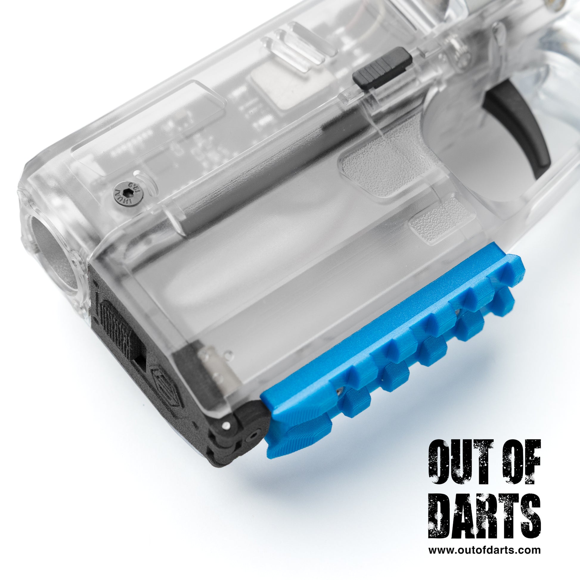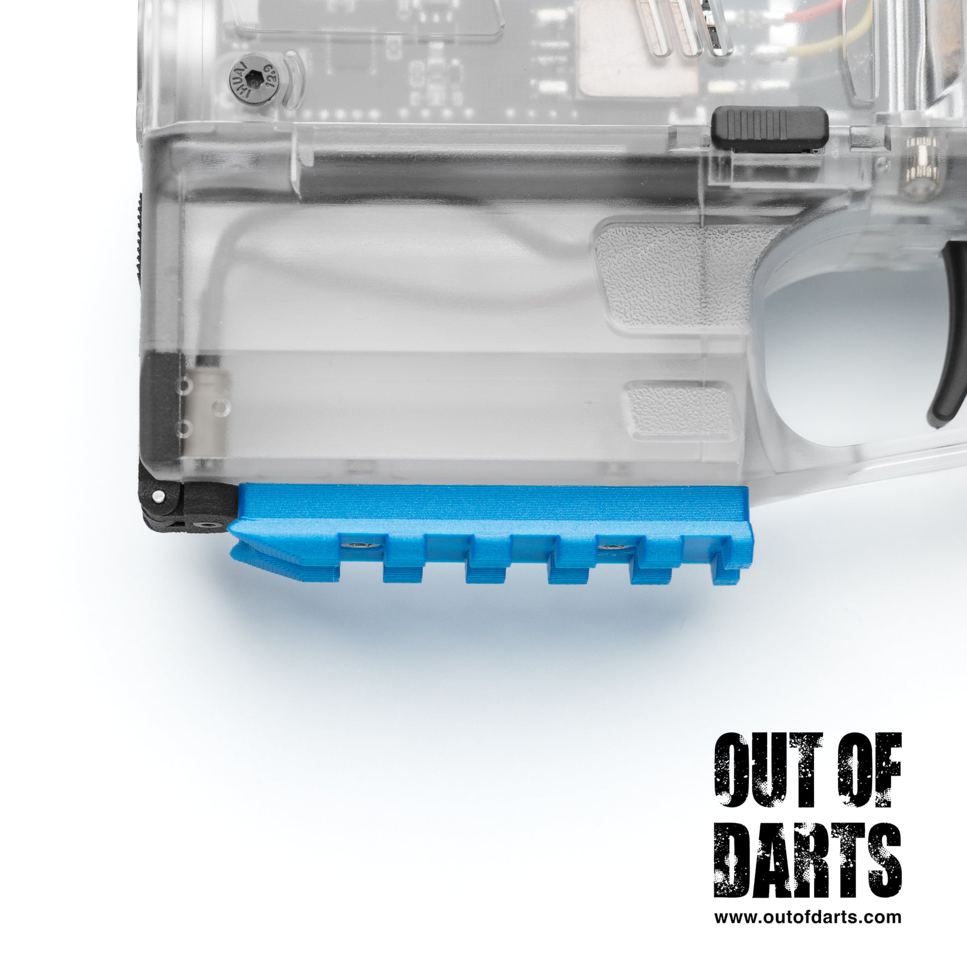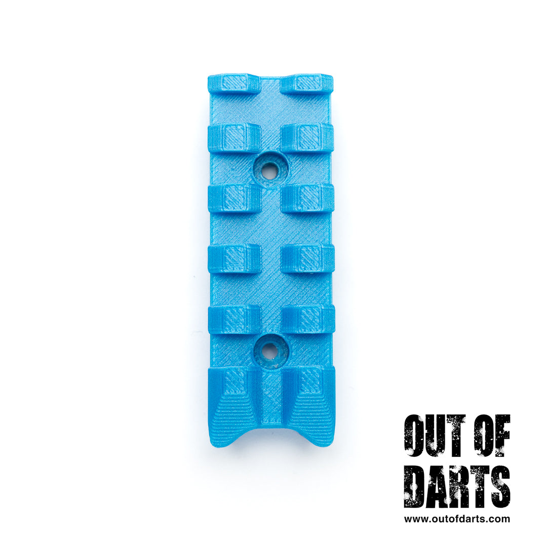 The RedCowl Diana Bottom Rail is a small length of Picatinny-compatible tactical rail designed to be mounted underneath the battery compartment of the Hare Tech Diana Blaster. This low-profile 3D-printed rail can hold foregrips, flashlights, or other accessories in games that allow them, or it can add a splash of color to break up the blaster's silhouette.