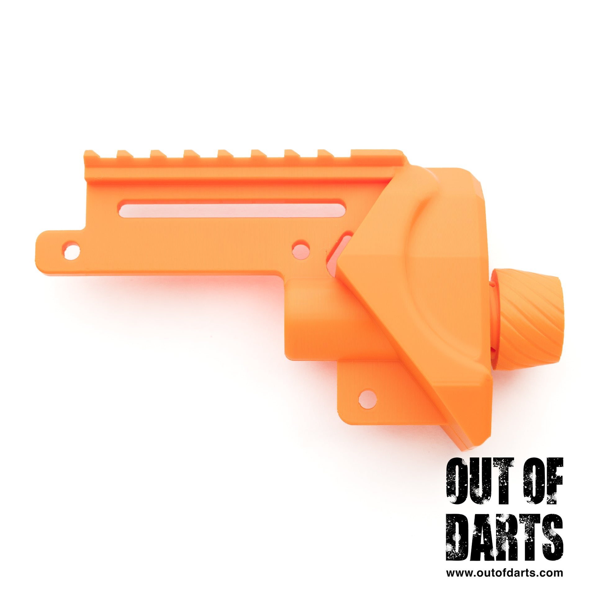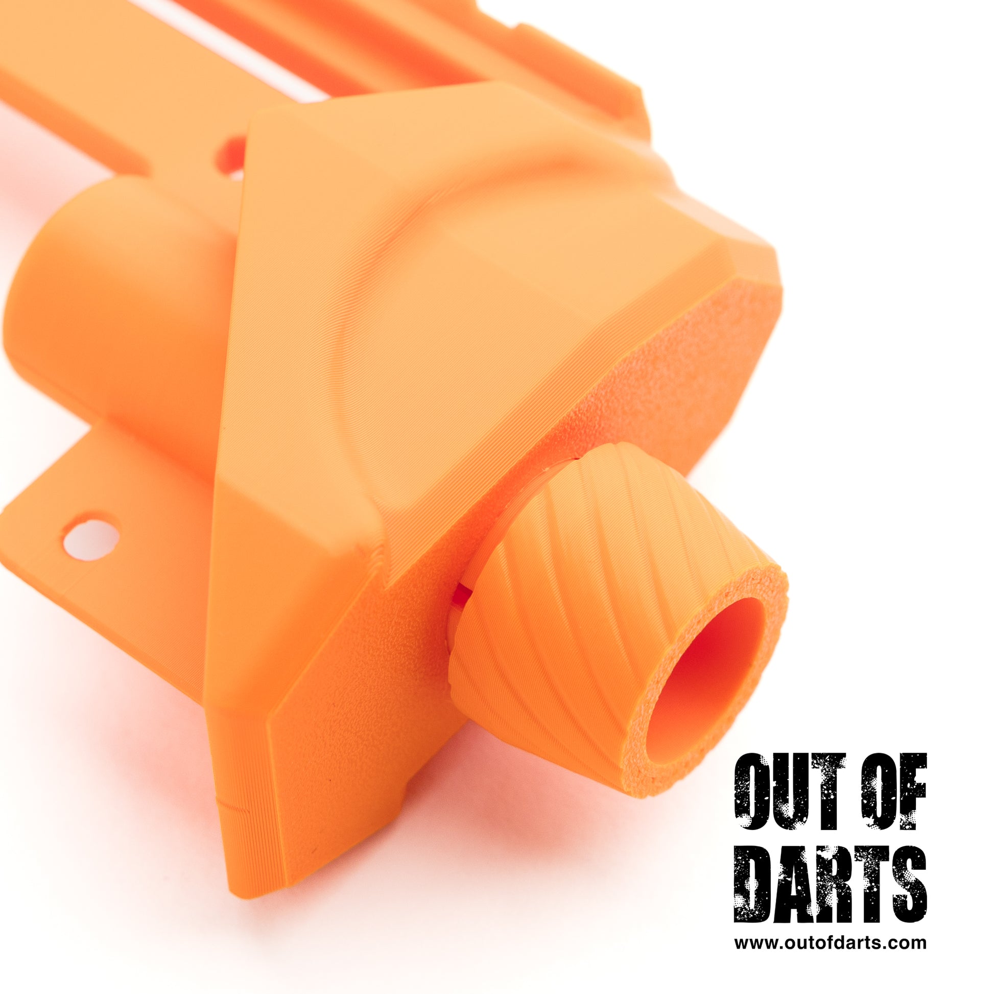 The RedCowl Torrent Barrel Collet is an easy addition to your blaster. This 3D part replaces the front end of the Nerf Pro Torrent, allowing for the use of other barrels secured with a simple collet. Additionally, it replaces the non-standard Nerf Pro rail with Picatinny to mount with any sights or attachments you'd like. For safety and compliance, these parts will always be printed in OOD Orange filament.