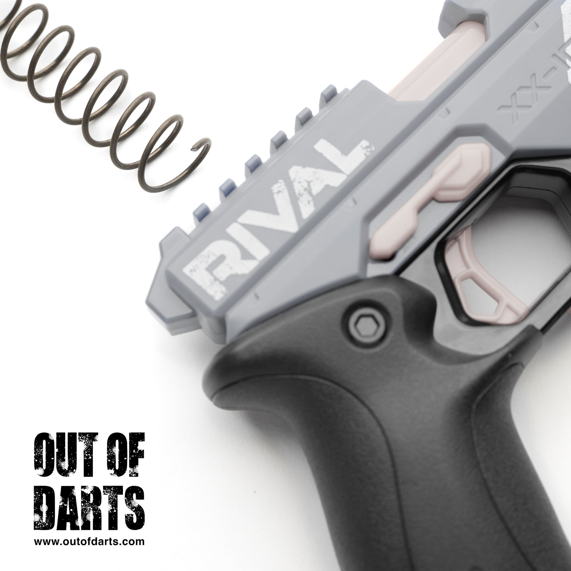 This precut Rival Knockout from the K25 spring is the perfect upgrade mod for your blaster for more incredible speed and accuracy. This mod is not for young kids, as you'll need to compress the spring a bit when installing it in the plunger tube! You can lose the plastic pieces in the handle, but everything else should stay where it is; you only need to remove the plunger tube. Use a flathead screwdriver to remove the cover off the notches, and be careful as it sits on a pretty tight fit. This spring, it has been custom-cut and tested to fit the Rival Knockout blaster.