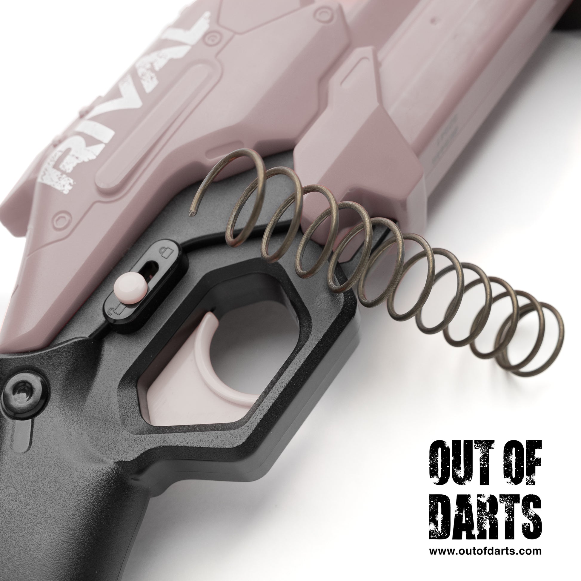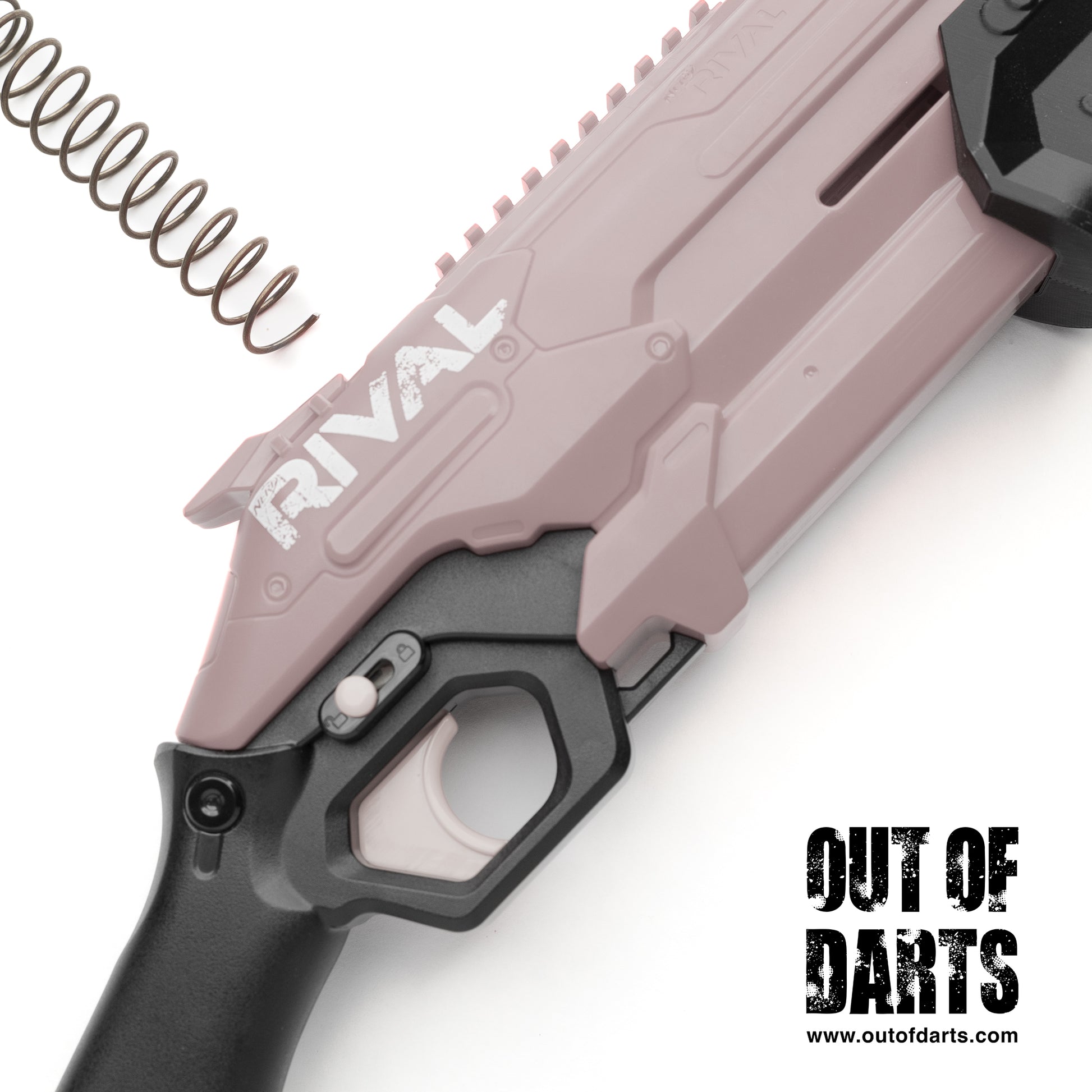 This Rival Takedown spring is pre-cut from a K25 and has been tested to match your blaster. This mod is not for young kids! You'll need fairly strong hands to prime this spring. This spring has been custom cut and tested to fit the Takedown blaster.