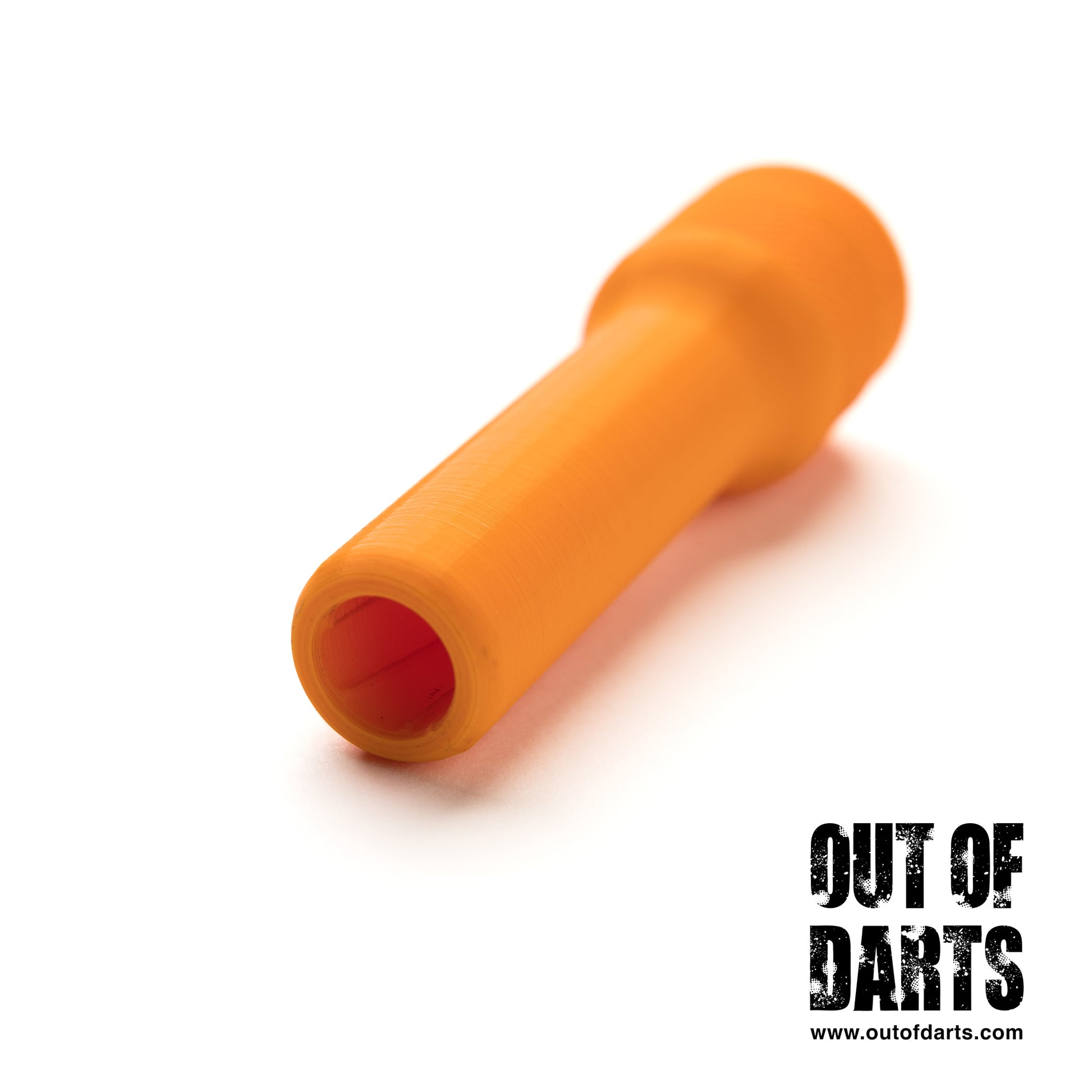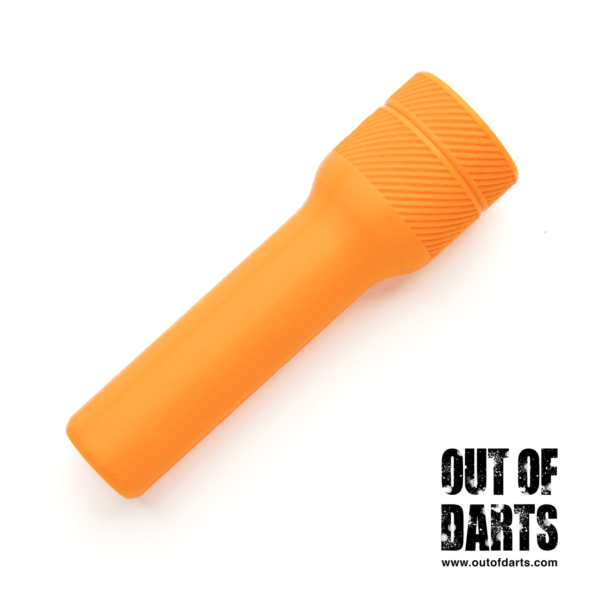 The Silly "Spigot" SCAR is a trivictus-style PCAR designed by Sillybutts to improve the accuracy of any blaster with an exposed 16mm barrel. It features an O-ring-locking collet for firm installation and to provide a better seal. The outer diameter allows you to fire a mega XL dart off of any higher-powered blaster