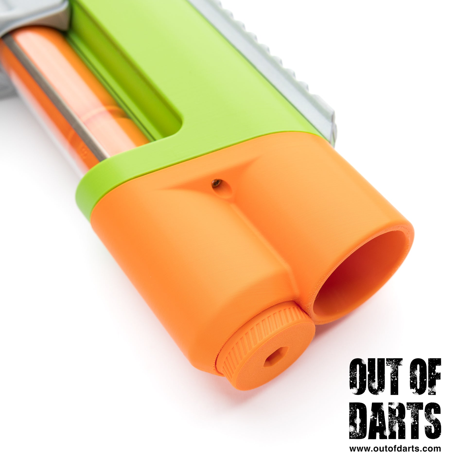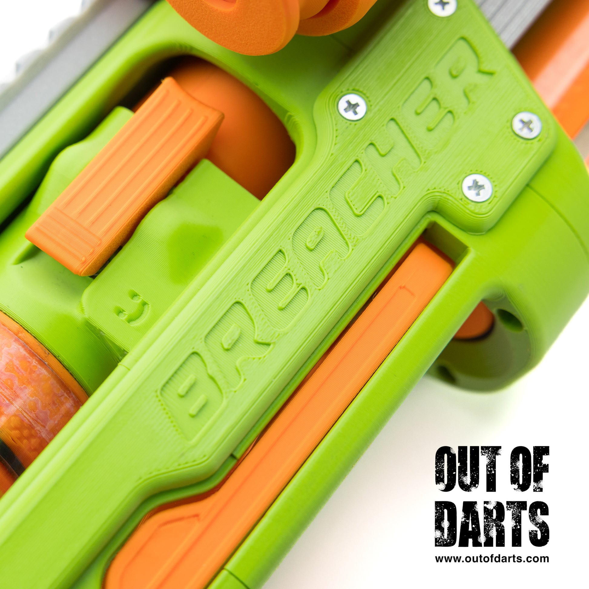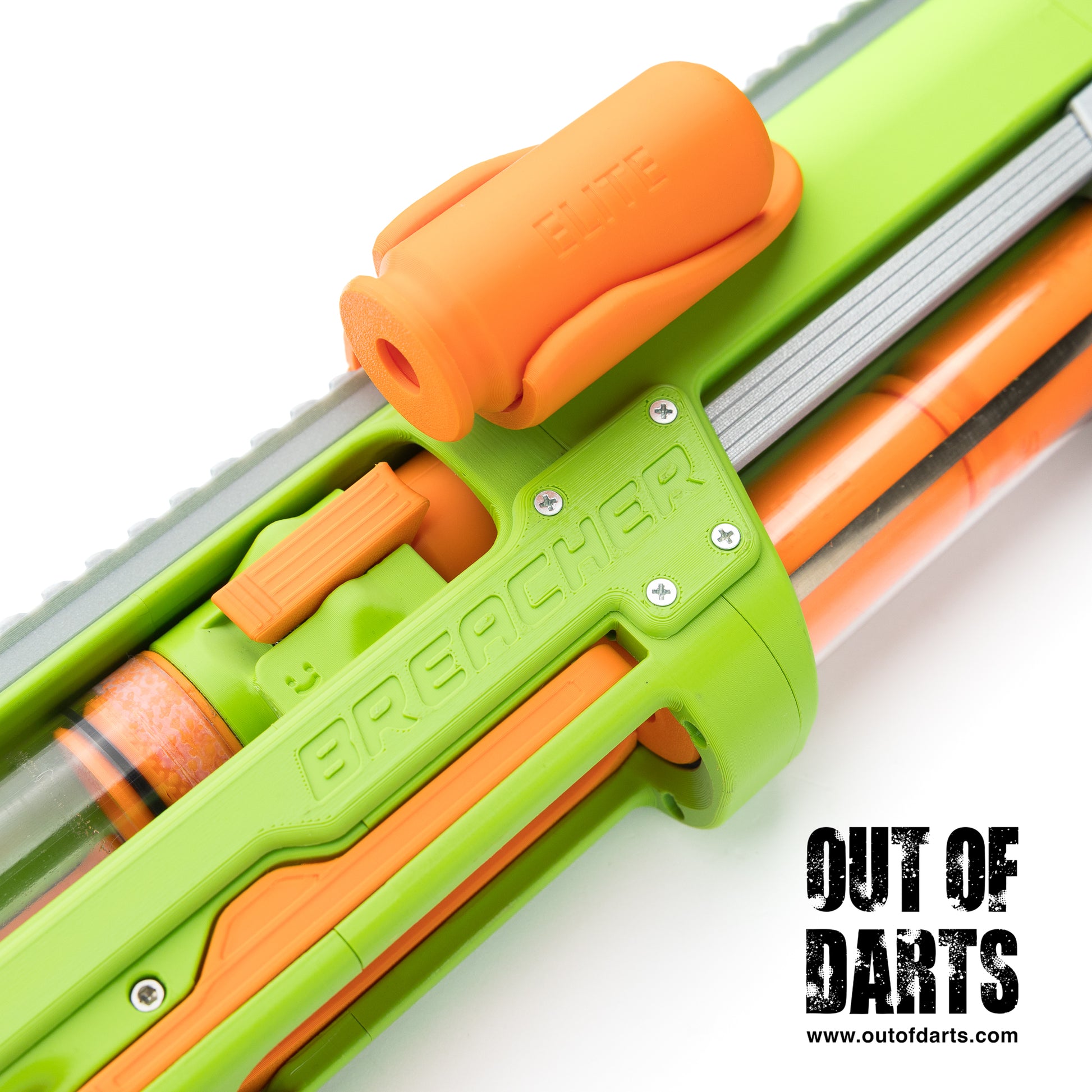 The Sillybutts Breacher is a shell-ejecting pump-action spring-powered blaster currently in an open beta release. Featuring an expandable tube magazine and lifter mechanism, this blaster is ultimately what Sillybutts had in mind when he designed his Silly Shells. Complete with bearing-assisted prime and constant-force mag springs, this shotgun-style blaster features a smooth and satisfying action. Additionally, its intimidating size and aesthetic match the power and versatility that can adapt to the ammo needs of any game or play style.