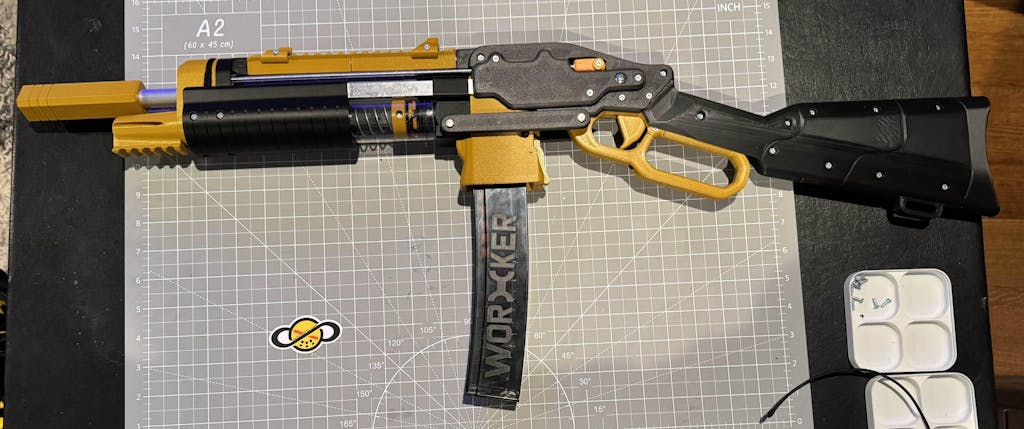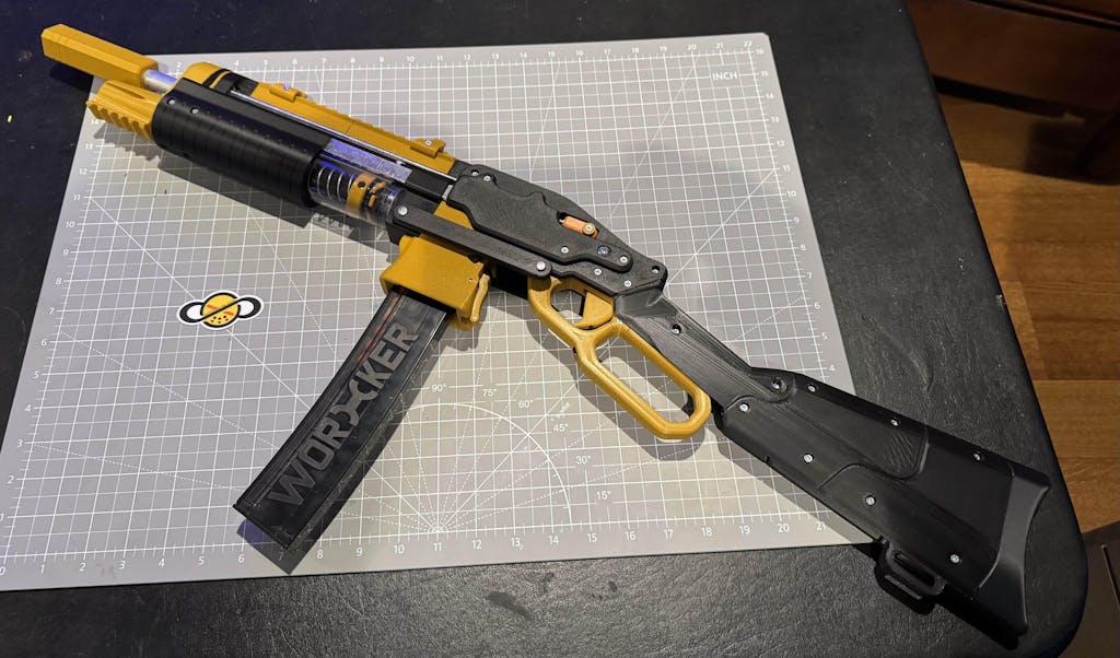 The SLAB (or “Silly’s Lever Action Blaster”) is a 3D-printed lever-action spring-powered blaster. Featuring a unique moving magwell assembly, this blaster is a joy to use. Additionally, its turnaround-style plunger and breech pack a lot of power while retaining its classic aesthetic.