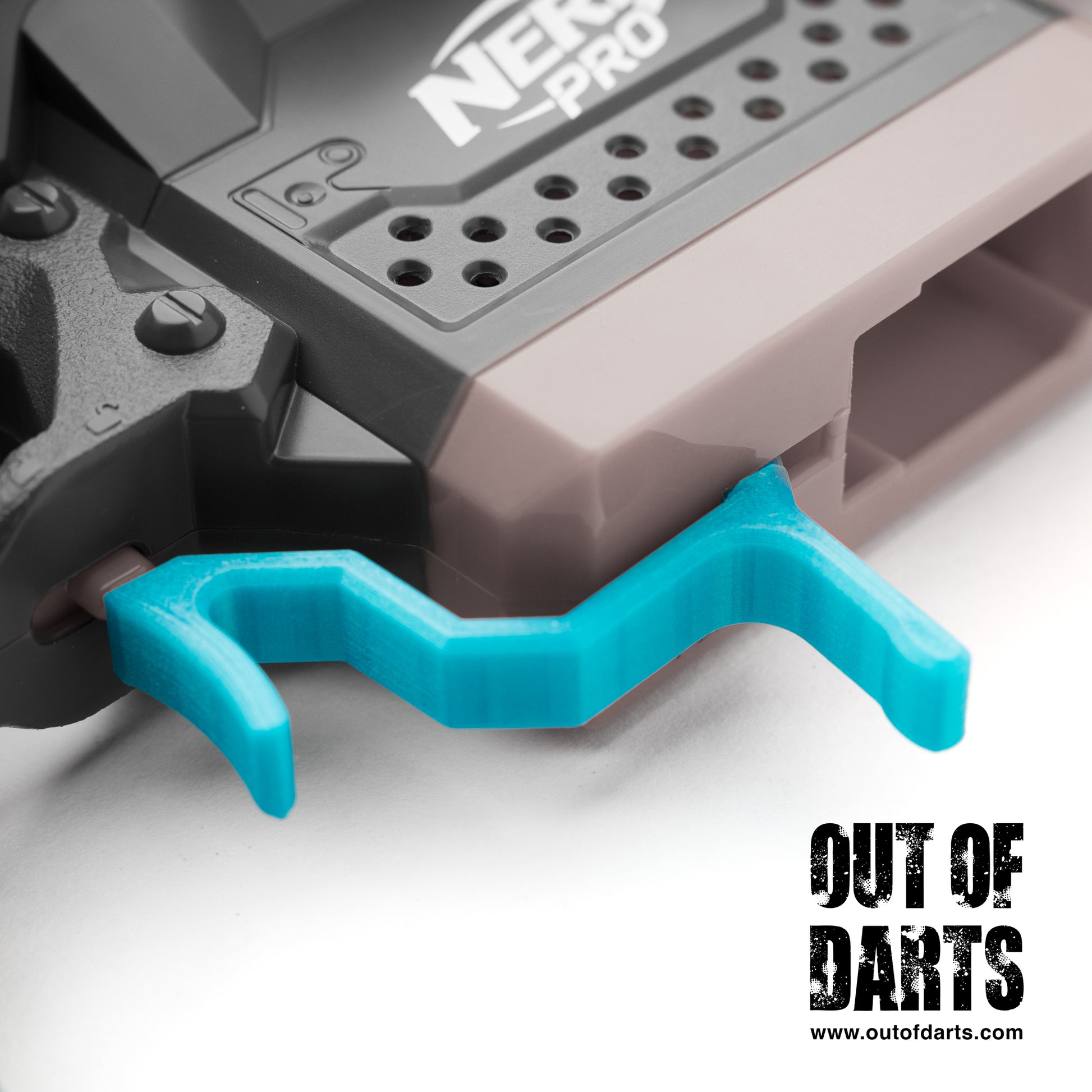 This replacement mag release offers the option to release magazines with the main or support hand when using the Stryfe X. This dual mag release acts as both an extended mag release and has an arm for use with the main hand's middle finger to give more options when reloading. This part requires opening the blaster to install but does not require any shell cutting.