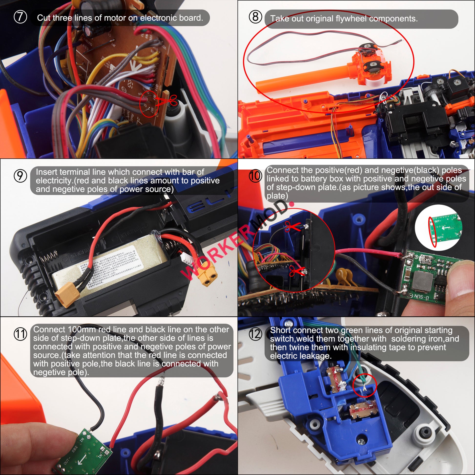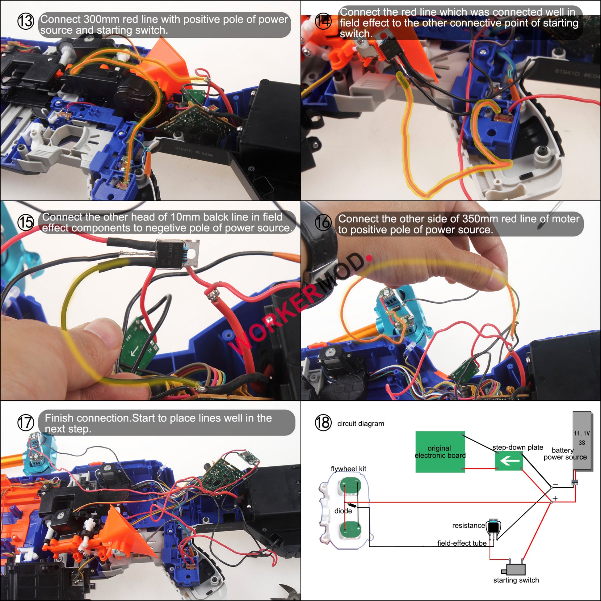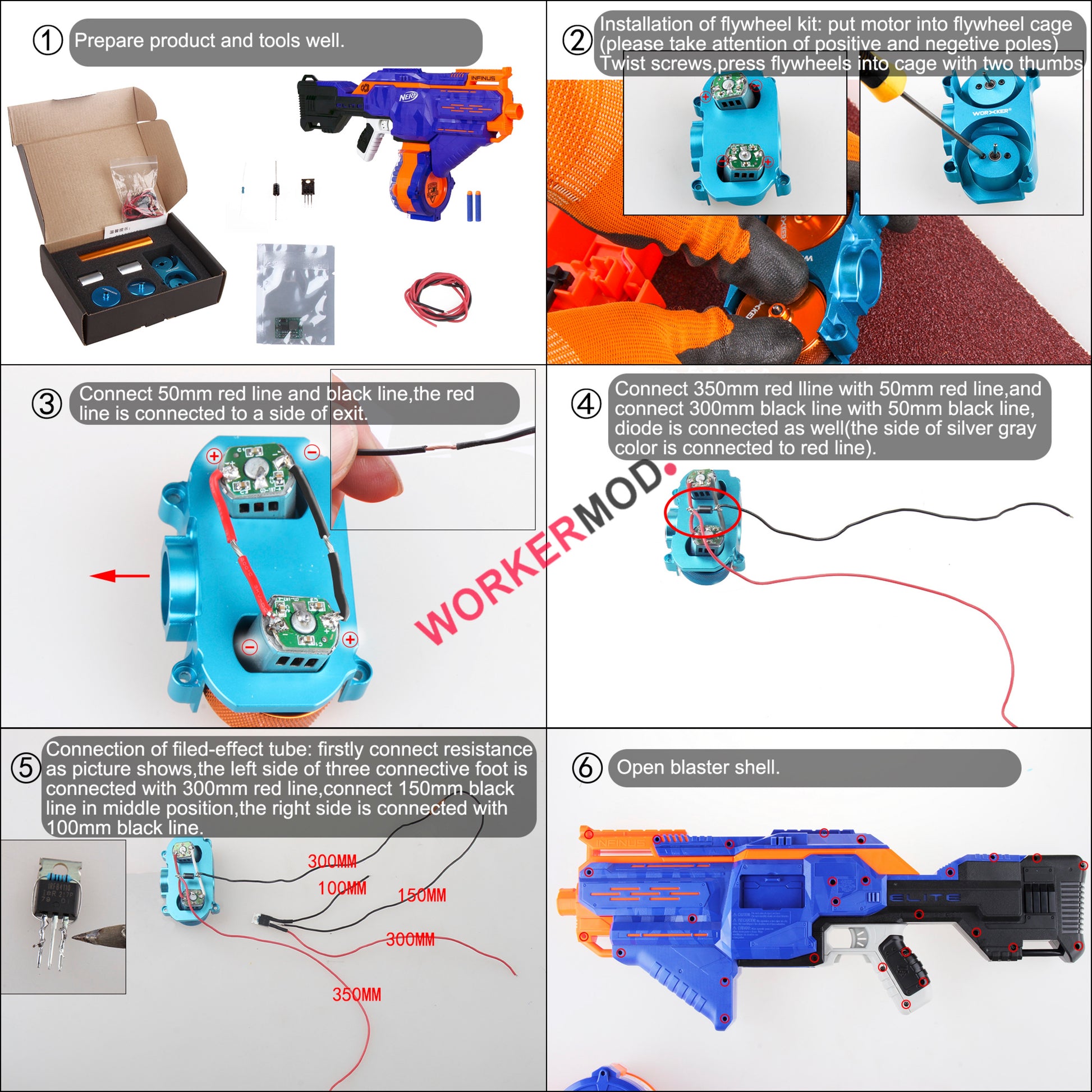 My son and I finished this mod over two weekends and the results did not disappoint. The instructions need a 2nd pass from the manufacturer. Thankfully Out of Darts was very responsive to questions to get us through the sticky points. There is a device that looks like a capacitor not mentioned in the instructions. That is a PTC that goes on the red line between motors and switch to prevent overheating during a jam. The included switch takes work to install and we ordered a replacement switch after botching the install. We cut the switch trying to make the button work sideways. I'd love an example switch layout in the instructions. Good tools were very helpful. I was glad we had a good soldering iron, flat clippers, wire strippers, solder sucker and solder wick. We started with lead-free solder. Eventually we gloved up and used lead solder at lower temperatures to protect the existing electronics and plastic connectors. We also did not use the included motors because my son wanted bigger ones which barely fit. I suspect the original kit motors will make the gun useable instead of terrifying.