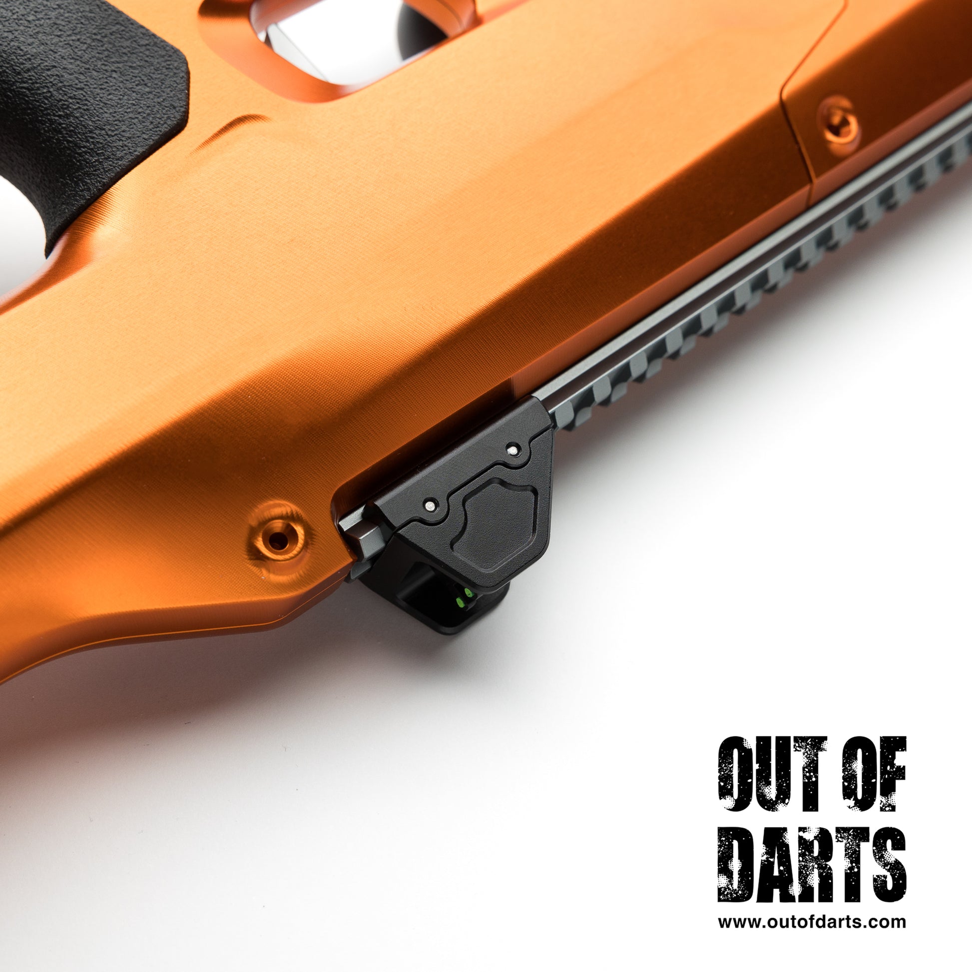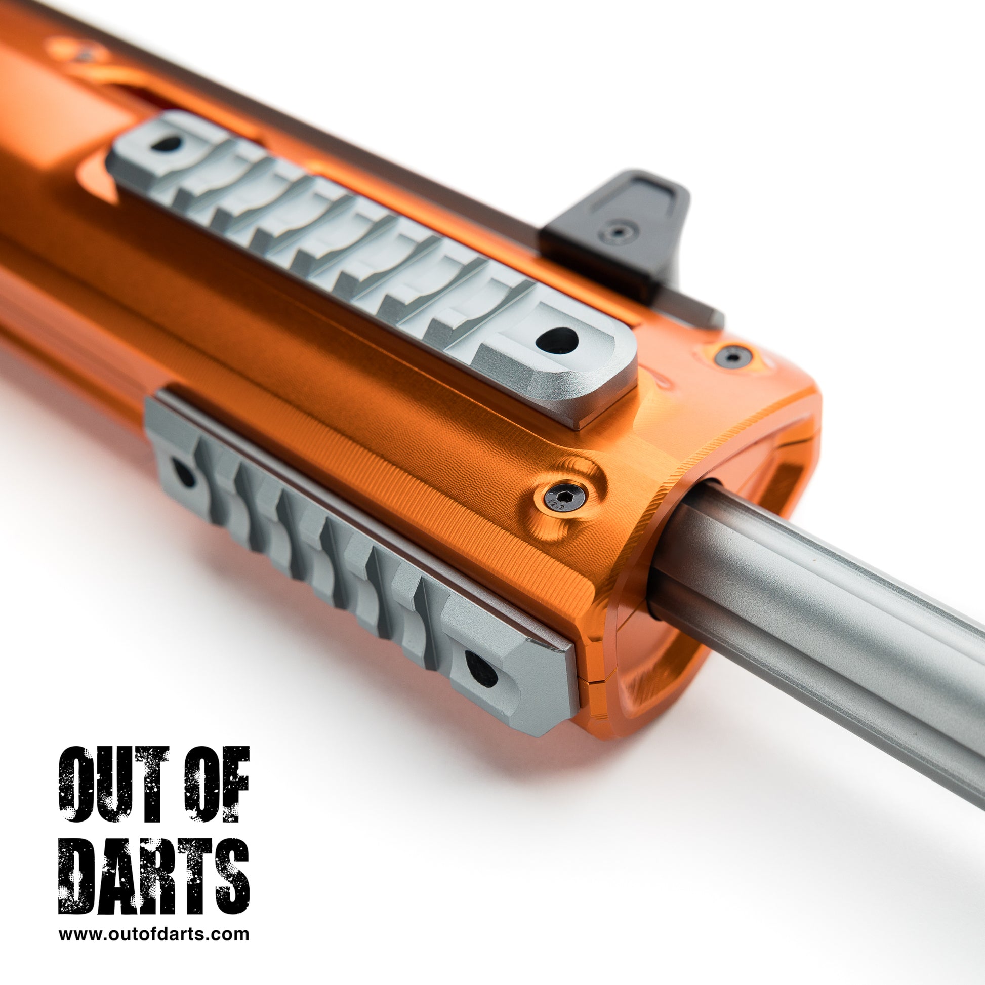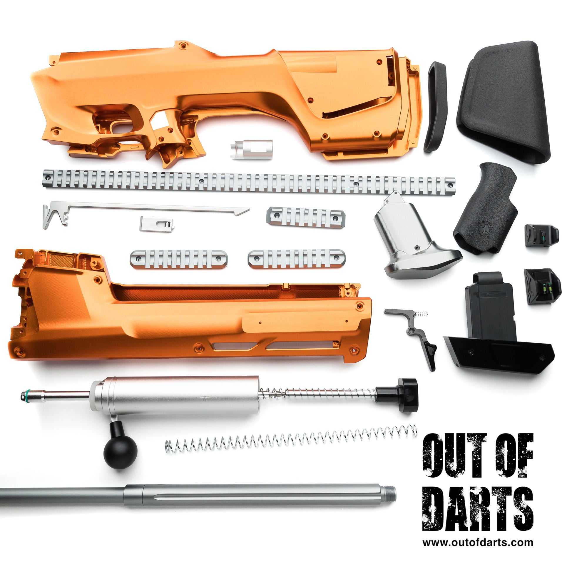 This Full-Metal Edition is a premium DIY Kit with a CNC aluminum shell! It features the same sleek "sniper" aesthetic as its polymer sibling with an anodized orange all-metal shell finish. This stunning show-stopper blaster is a high-end collectors' item for the foam-flinger who has it all!