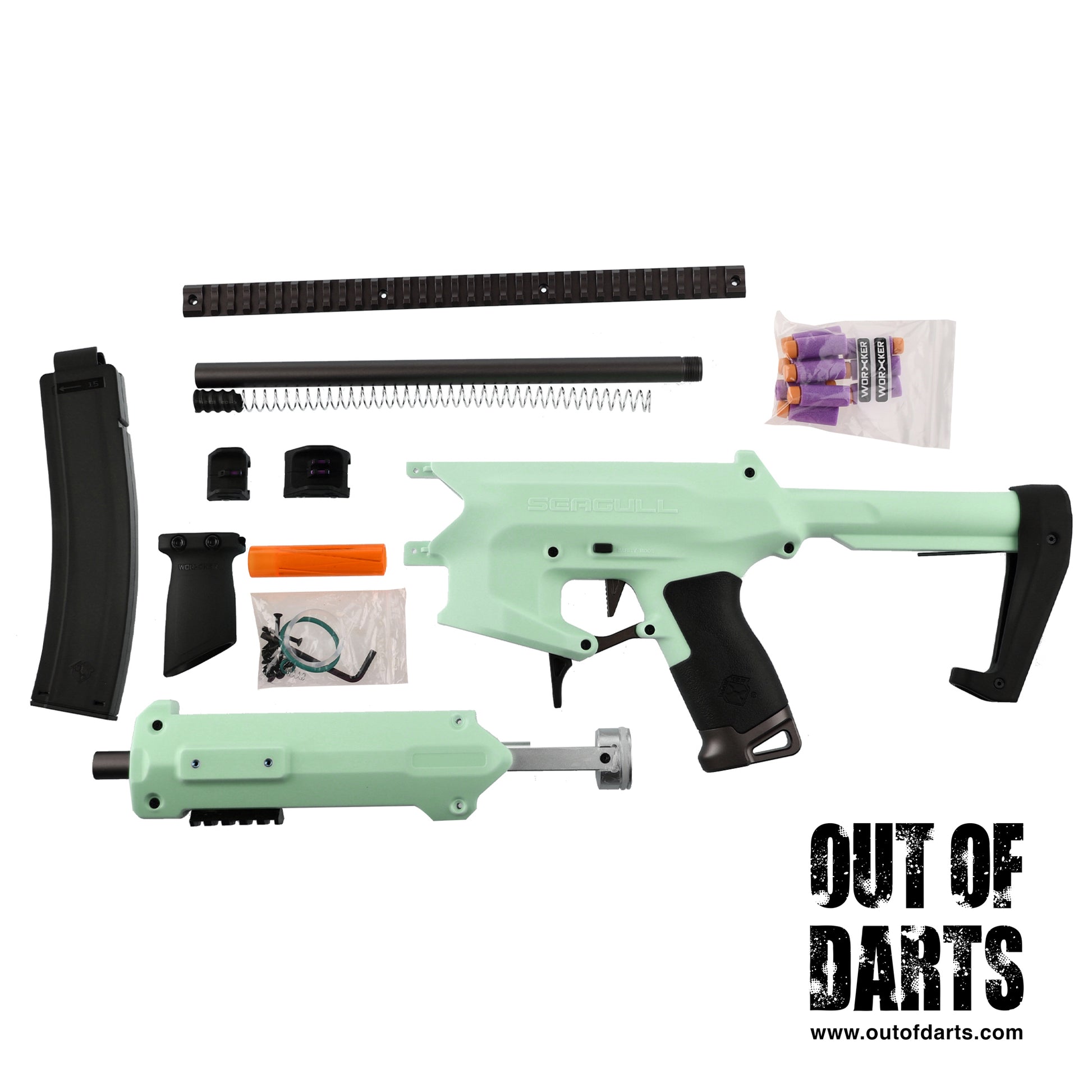 The Worker Seagull CQB Blaster is an ultra-compact, high-powered springer perfect for various game types. It's a smaller sibling to the Worker Harrier, featuring a smaller plunger volume and minimized furniture with the same excellent build quality. Additionally, this blaster is highly customizable, with a threaded breech barrel system and a wide selection of springs. The Seagull is one of our most popular blasters and an excellent choice for newbies and veteran players alike!