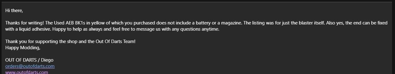 Before Christmas, OOD had a listing for a used Zius BK1. Used around the shop, this blaster was on sale for $30 less than normal. However, this blaster uses a proprietary magazine, the butt stock connector is damaged, causing it to slide around, and there's no LiPo battery. In short, the blaster they used around the shop and sold cannot fire. I asked Diego why they would sell a blaster without the appropriate pieces and he simply offered to sell me more parts, providing a link to that blaster's page, and, if I don't like it, to return it.