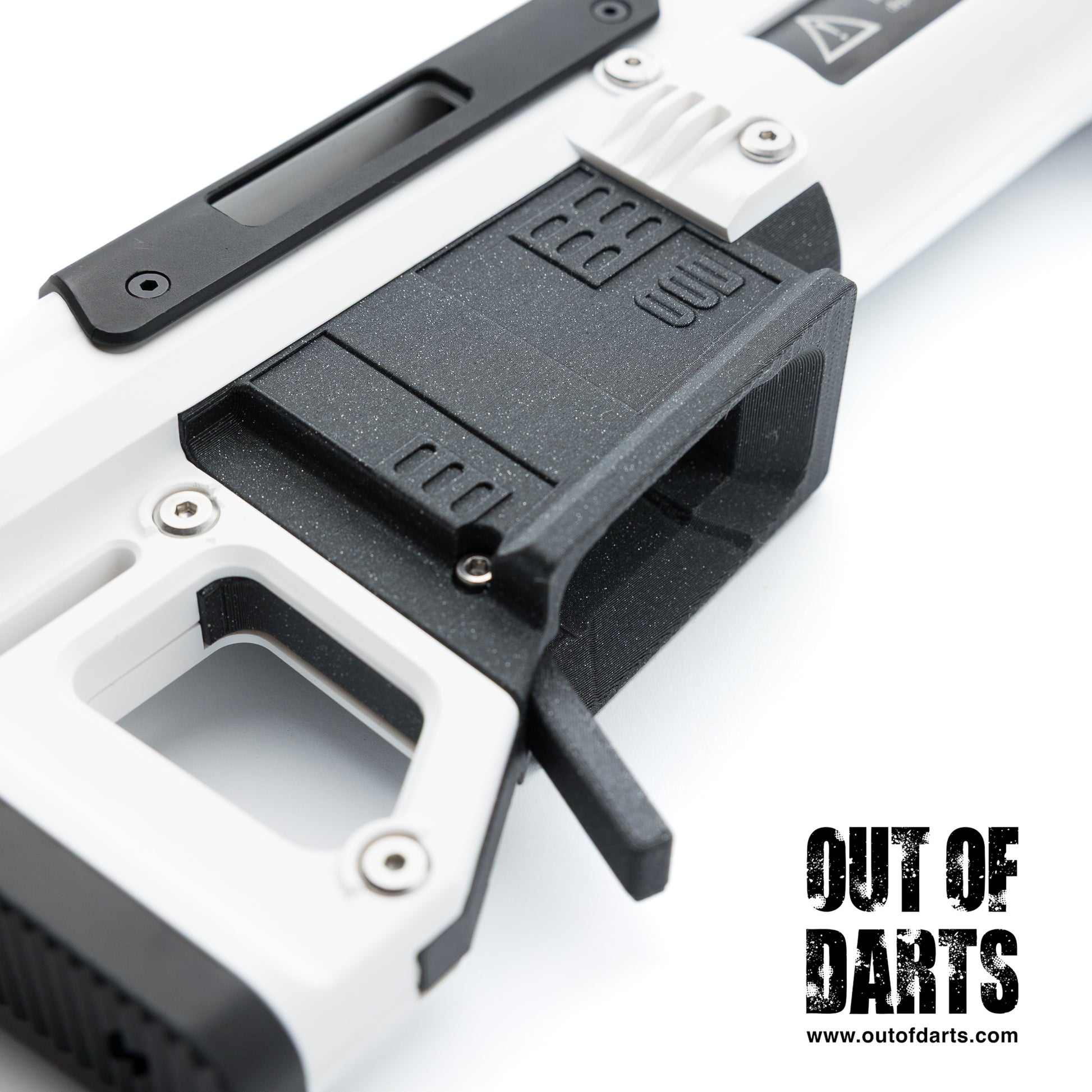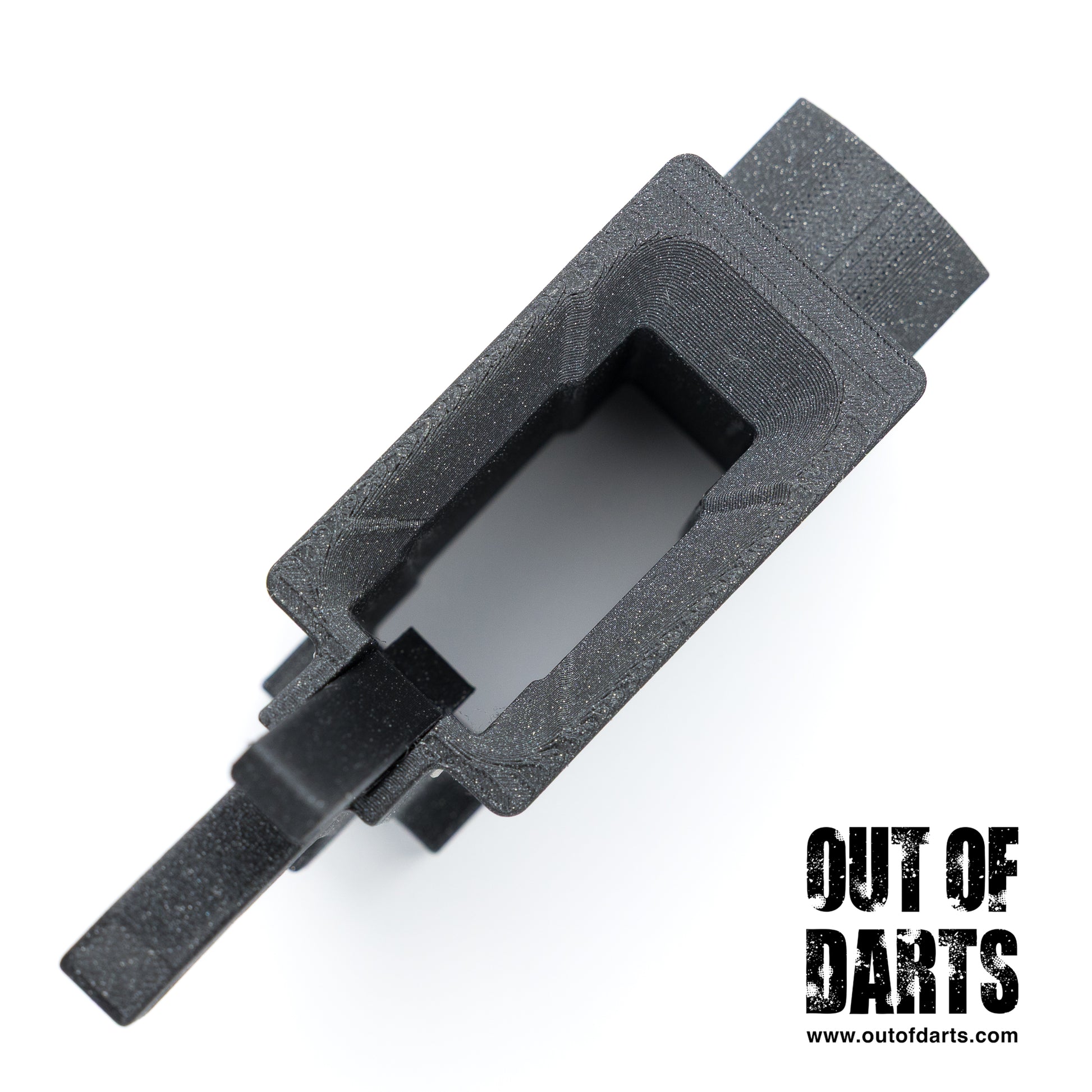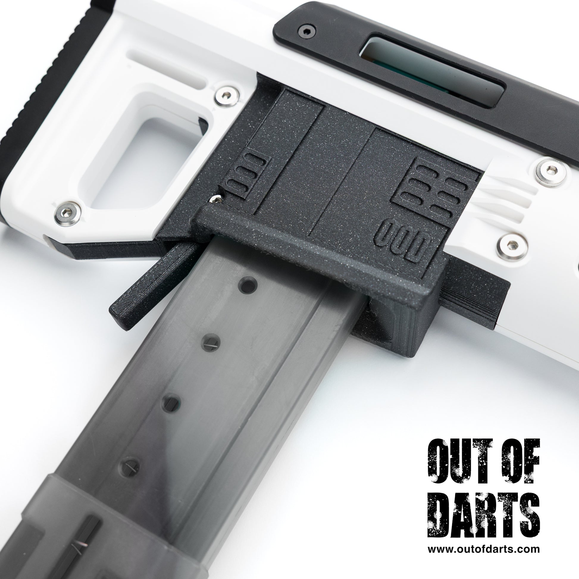 The S400 Talon Magwell is a 3D-printed magwell for the ZWQ S400 Zebra Bullpup Blaster designed by Luke Goodman at Out of Darts. Featuring a standard talon magwell with a rear paddle mag release, this part is an upgrade from the magwell included with the Zebra and doesn’t require modification like the injection-molded talonoid magwell. Additionally, its forward-facing talon geometry and pronounced flare make it easier to use existing standard magazines and muscle memory.